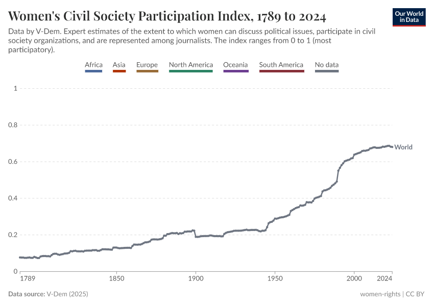 “Data Page: Women's civil society participation index”, part of the following publication: Bastian Herre, Lucas Rodés-Guirao, and Esteban Ortiz-Ospina (2013) - “Democracy”. Data adapted from V-Dem. Retrieved from https://enhance-improve-who-empower.owid.pages.dev/grapher/women-civil-society-participation-index [online resource]How to cite this data