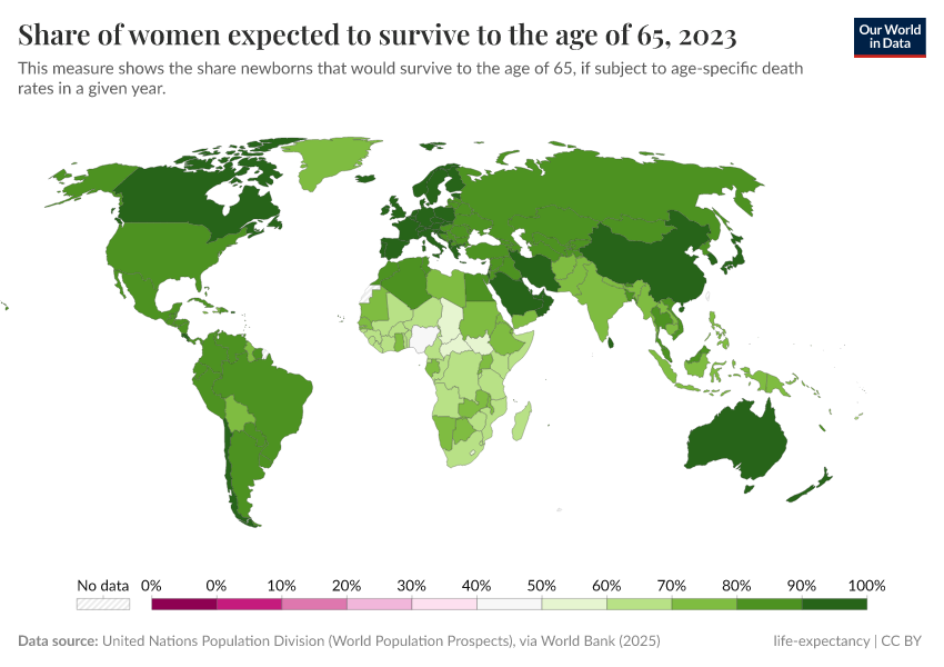 UN Population Division (via World Bank) (2025) – processed by Our World in Data. “Share of women expected to survive to the age of 65” [dataset]. UN Population Division (via World Bank), “World Development Indicators” [original data]. Retrieved May 8, 2025 from https://enhance-improve-who-empower.owid.pages.dev/grapher/women-survival-to-age-65
