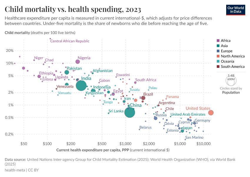 The chart below shows how healthcare spending is related to child mortality, in the same format.
