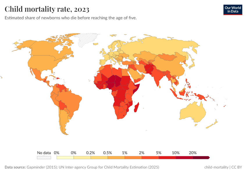 Child mortality measures the share of newborns who would not survive to their fifth birthday, given death rates at young ages in a population.