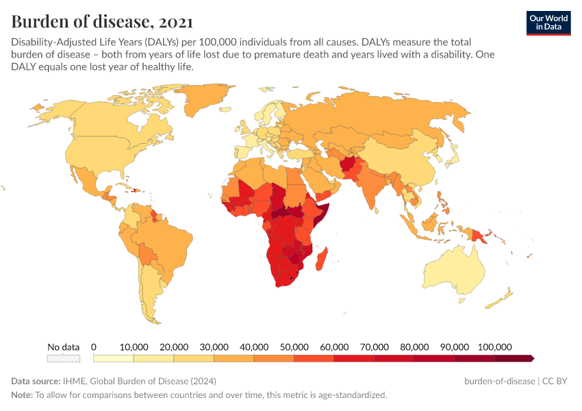 This map shows DALYs per 100,000 people in the population. It is thereby measuring the distribution of the burden of both mortality and morbidity around the world.