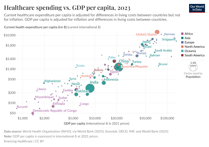 Countries with a higher per capita income tend to spend more on healthcare, which you can see in the chart below.2