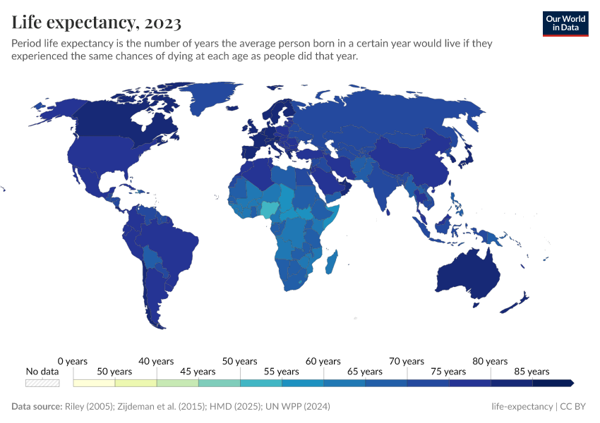 The map view shows a comparison of life expectancy across countries. As you can see, although the global disparity in life expectancy has reduced substantially, there are still huge differences between countries.