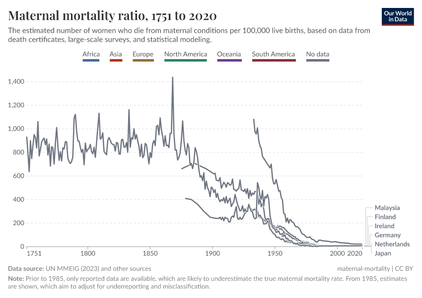 For example, Finland began reducing its maternal mortality rates in the mid-19th century, but it took over a century to achieve today's low levels. Malaysia, on the other hand, saw similar improvements within just a few decades, which occurred much later.