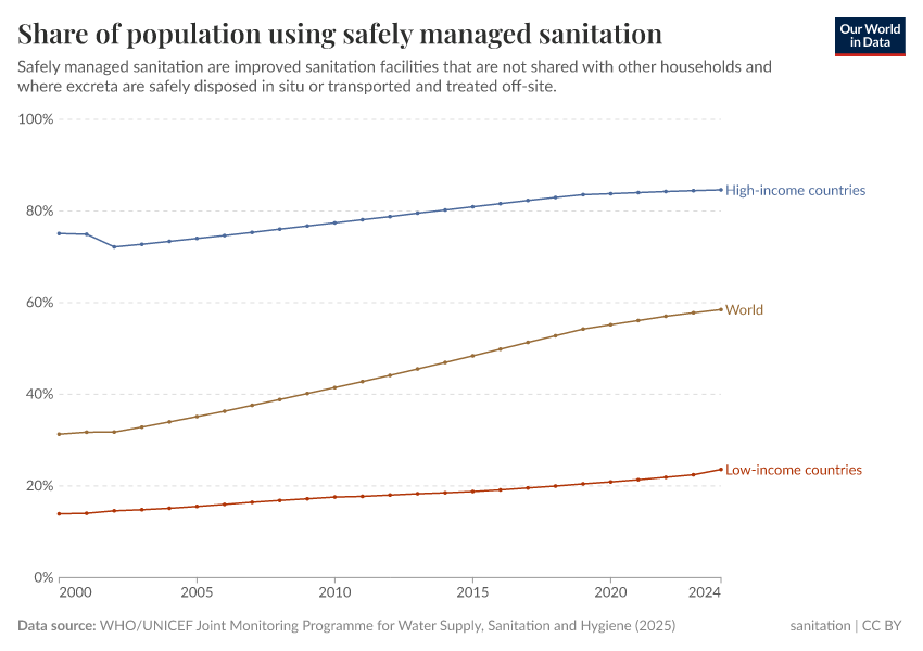 In the chart below, you can see share who use safely-managed sanitation, which has risen gradually over time.