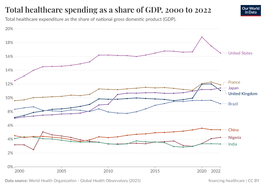 In recent decades, spending on healthcare has been relatively stable in countries. But there are very large differences in the level of spending between countries.