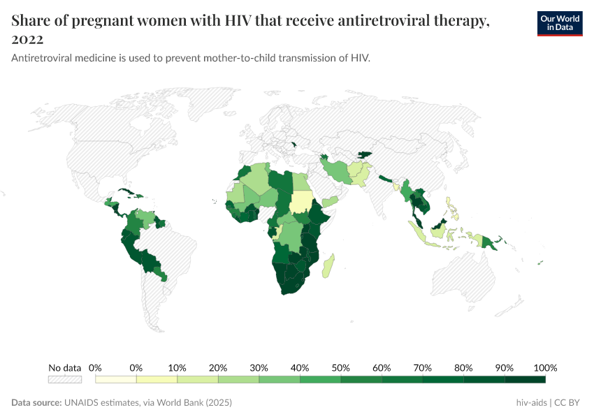 This map shows the share of pregnant women infected with HIV who receive antiretroviral therapy – a vital intervention to prevent the transmission from mother to child.