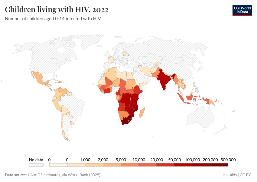 The map shows the total number of children newly infected with HIV yearly. Globally — with similar trends at national levels — the number of new infections in children peaked around the early 2000s (with over 500,000 new infections per year globally), followed by a rapid decline over the last decade.