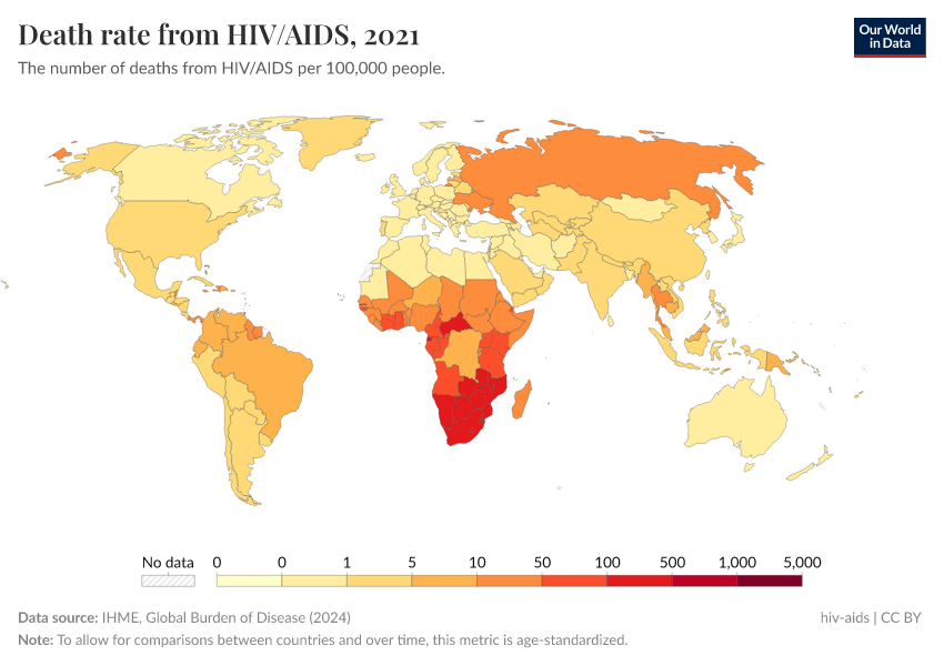 The significant health burden of HIV/AIDS across Sub-Saharan Africa is also reflected in death rates. Death rates measure the number of deaths from HIV/AIDS per 100,000 individuals in a country or region.