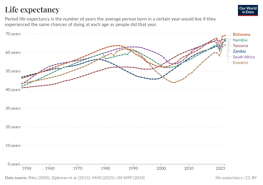 We see a dramatic drop in life expectancy starting around 1990, coinciding with the rise of HIV. In Botswana, life expectancy fell by a decade; in Eswatini, it fell by two decades. Since the early 2000s — as progress has been made in tackling HIV — we see that life expectancy has been rising again.