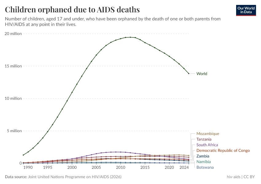 Some children have lost either one or both parents to AIDS. This does not necessarily imply that children orphaned by AIDS have HIV themselves (although, in some cases, HIV has been transmitted from mother to child). The chart shows the number of children (aged 17 and under) orphaned from AIDS deaths.