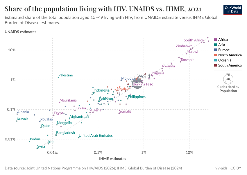 Several sources publish estimates on HIV and AIDS. Two of the most established sources, presented on this page, are UNAIDS and the Institute of Health Metrics and Evaluation (IHME). The charts below show a comparison of these two sources' estimates.