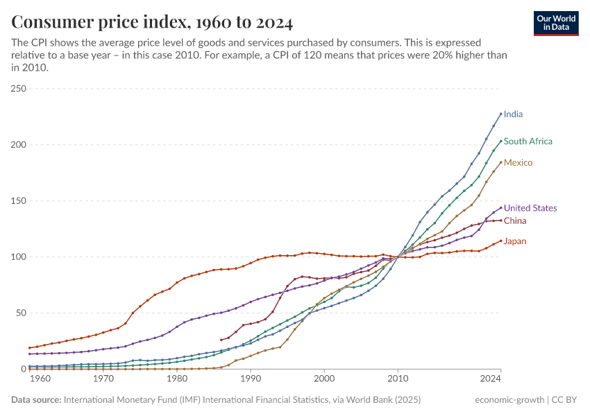 The following chart shows CPI data gathered from national statistical offices by the International Monetary Fund. The base year in this case is 2010, so a CPI of 120 means that prices rose by 20% since 2010.