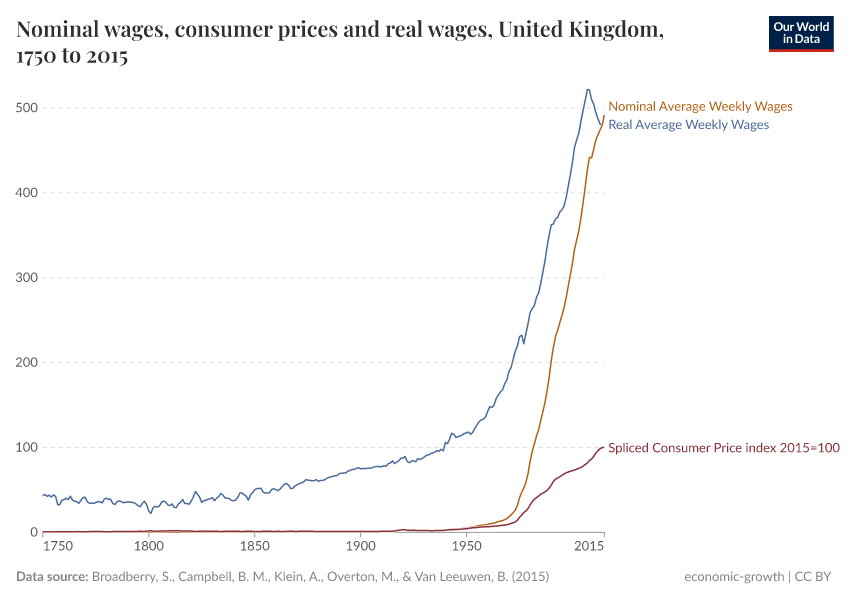 Between 1750 and 2015, nominal wages in the UK increased from £0.29 to £492 per week. This is a 1695-fold increase.
