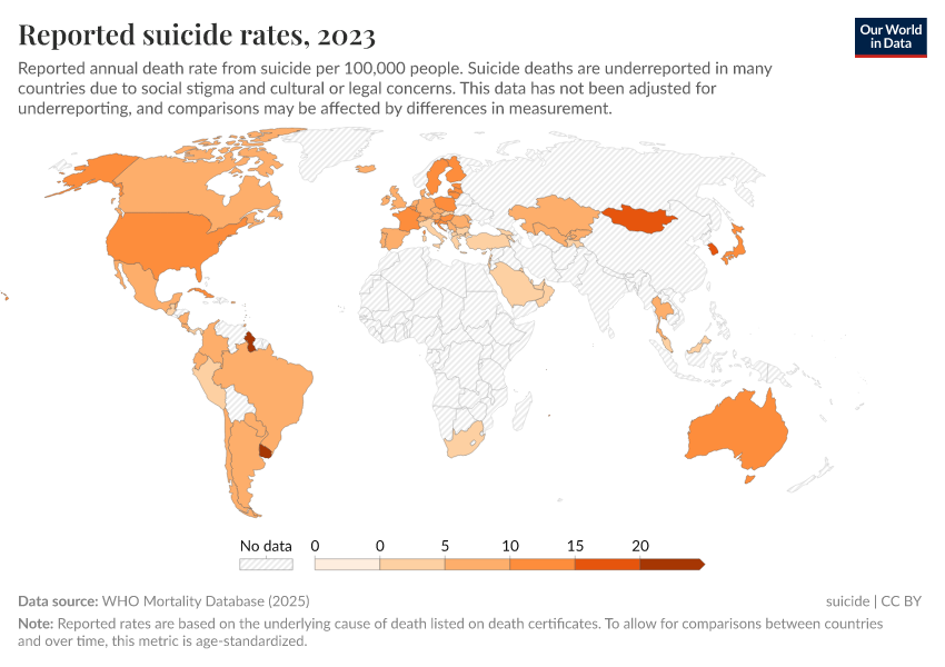 The map below shows the reported suicide rate in each country in the WHO Mortality Database (WHO MDB). It republishes reported data from all countries that have registered at least 65% of all deaths with a cause of death.