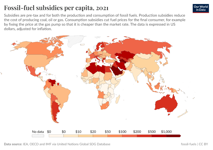 In the map below, you can see the level of fossil fuel subsidies given per person. This includes production and consumption subsidies, and it is shown for 2021, before the energy crisis.