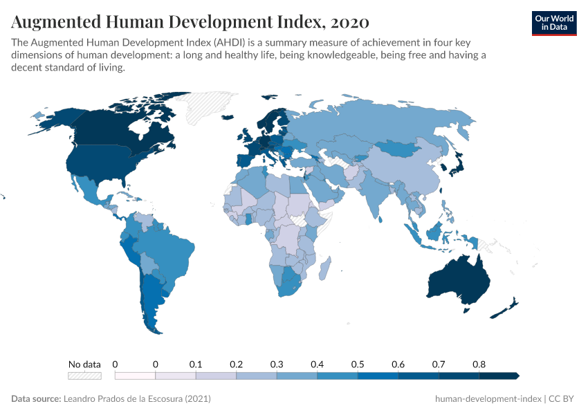 The Augmented Human Development Index (AHDI) is produced by the economic historian Leandro Prados de la Escosura.11 It gives a more historical perspective on human development by including long-run data.12