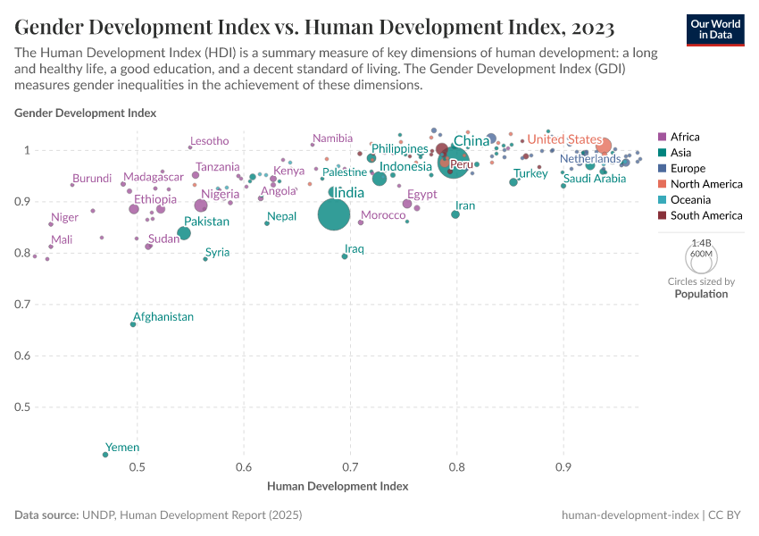 As another example, the following chart compares the HDI to the GDI. We again see that some countries do relatively worse when accounting for gender differences (such as Iran and Pakistan). In contrast, others do relatively better due to more gender-equal outcomes (such as Brazil and the Philippines).