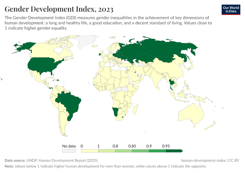 The GDI is the ratio of the female HDI to the male HDI. Values below 1 indicate higher human development for men than women, while values above 1 indicate the opposite. Values closer to 1 therefore indicate higher gender equality.