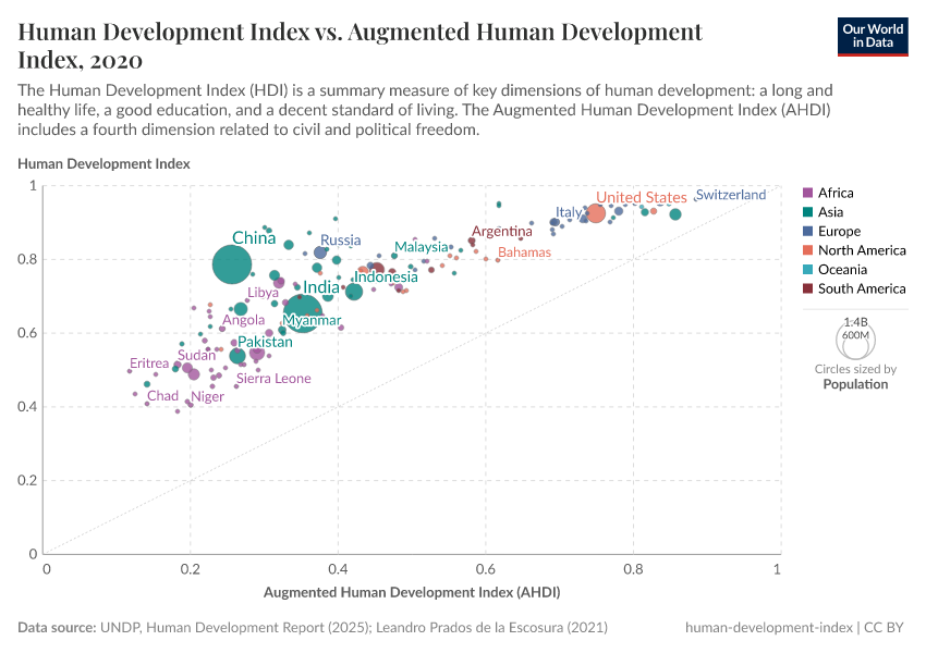 Like the HDI, the AHDI characterizes human development as people having long and healthy lives, being knowledgeable, and having a decent standard of living. But AHDI adds a fourth dimension — civil and political freedom — and is based on slightly different indicators: