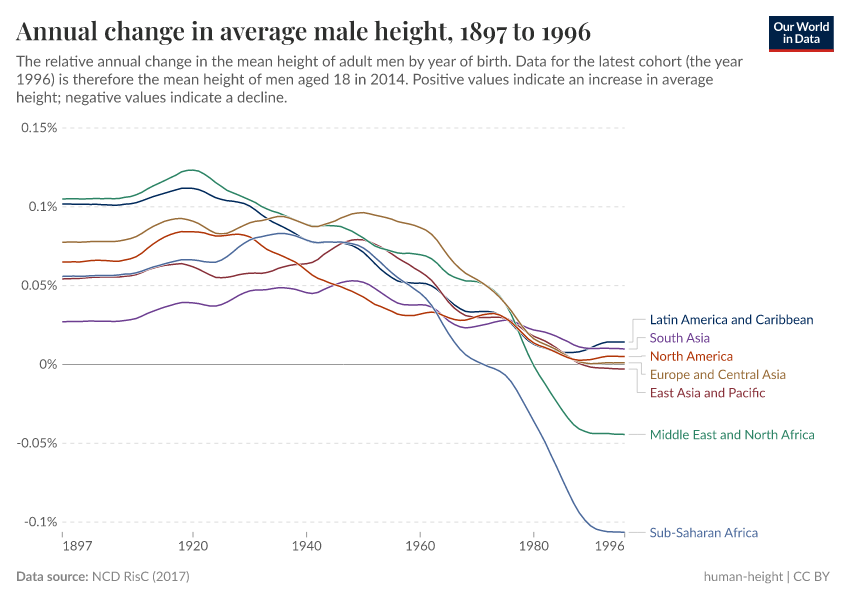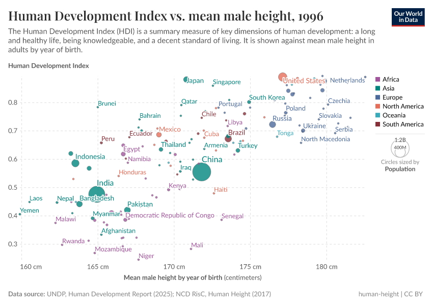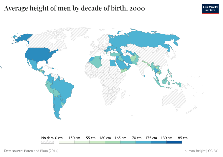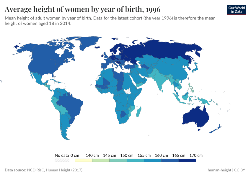 The data shown here comes from a global study, published by the NCD Risk Factor Collaboration (NCD-RisC) in 2016.4 This dataset is based on both demographic and health surveys as well as academic studies. It reports the estimated average (mean) height for adults by their year of birth, meaning that it only includes estimates for those who have reached the age of 18.
