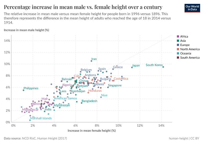 A century ago, South Korean men were on average 18 cm taller than women; this difference fell to 13 cm, meaning that South Korean women saw larger absolute gains in height than South Korean men.