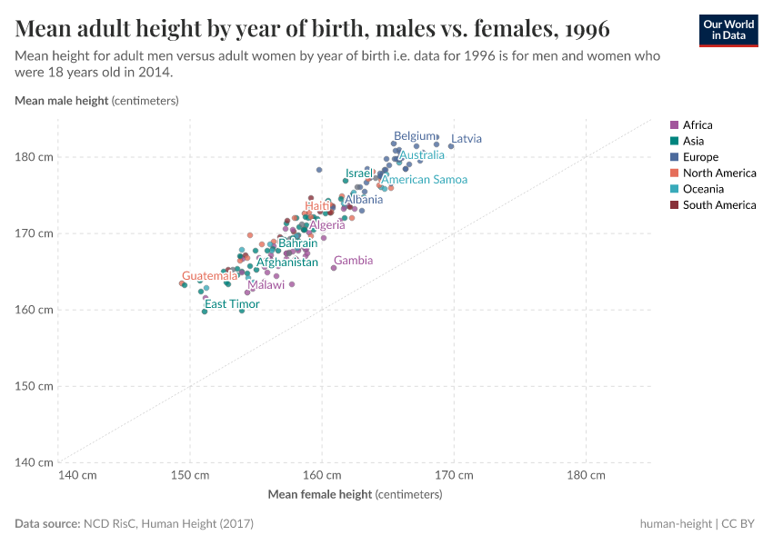 The scatter plot illustrates the difference between the average heights of men and women around the world. It plots average male height on the y-axis, and average female height on the x-axis. The grey line shows where these heights are equal.