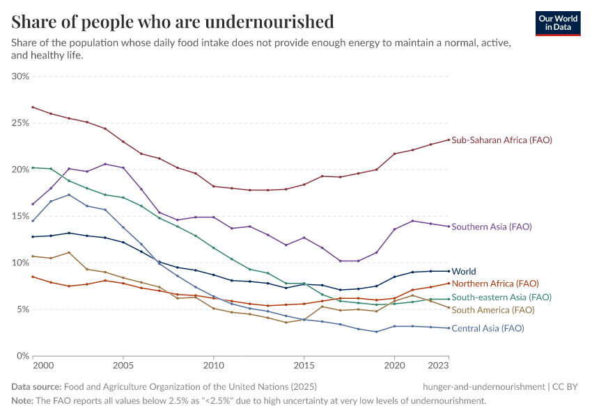 Hannah Ritchie, Pablo Rosado, and Max Roser (2023) - “Hunger and Undernourishment” Published online at OurWorldinData.org. Retrieved from: 'https://enhance-improve-who-empower.owid.pages.dev/hunger-and-undernourishment' [Online Resource]BibTeX citation