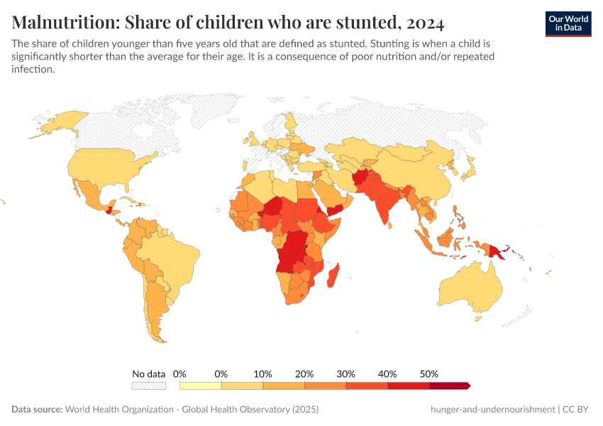 The fight against hunger focuses on a sufficient energy intake – enough calories per person per day. But it is not the only factor that matters for a healthy diet. Sufficient protein, fats, and micronutrients are also essential, and we cover this in our topic page on micronutrient deficiencies.