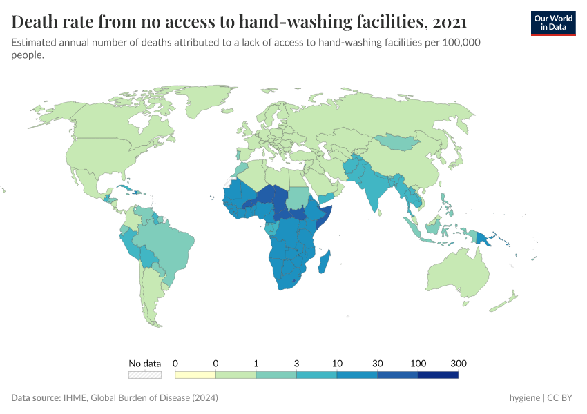 In this map, we see death rates from having no access to handwashing facilities across the world. Death rates measure the number of deaths per 100,000 people in a given country or region.