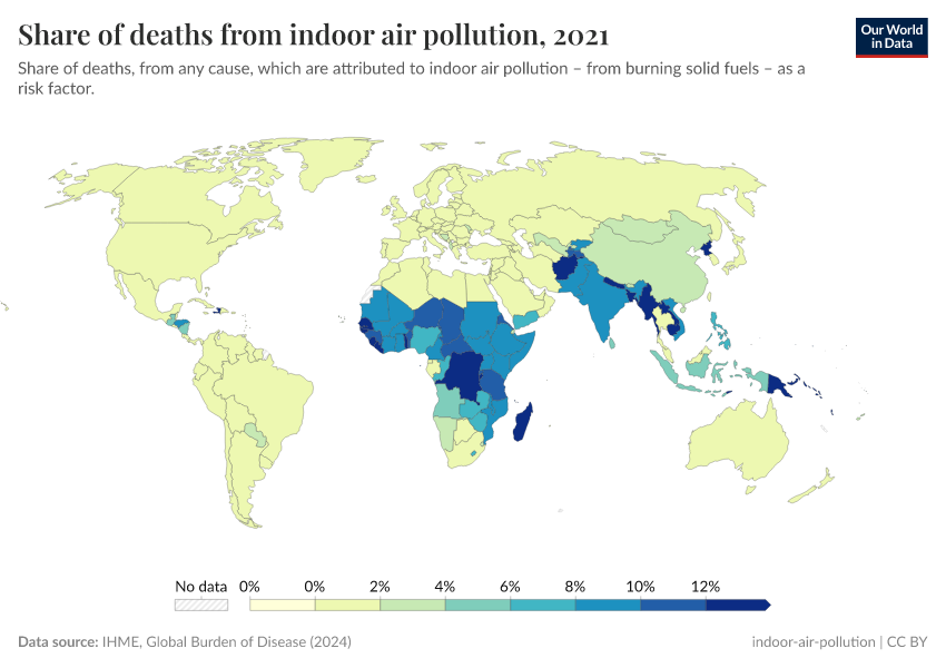 This is based on the share of deaths that are attributable to indoor air pollution based on the impact of air pollution on the risk of diseases like cardiovascular disease, lung disease, lung cancer, and others. In other words, it is an estimate of the share of all deaths that would be prevented if indoor air pollution was absent.