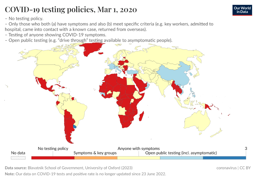 However, many countries conducted limited testing, as shown in the map below. It shows which population groups could be tested for COVID-19.