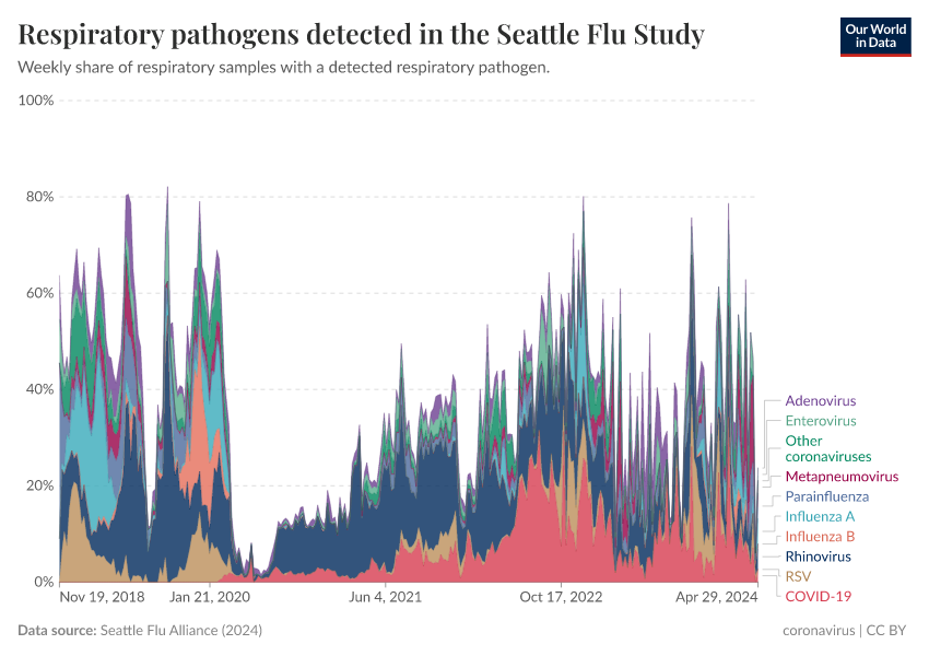 The chart below shows this with data from the Seattle Flu study, which tested respiratory samples from the Seattle Area for many potential respiratory pathogens.9
