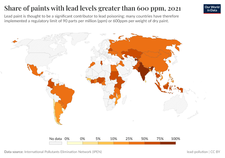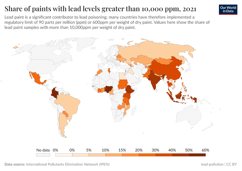 In the map here we see the share of tested paints that had lead levels greater than 600 parts per million (ppm) of the dry weight of paint. To put this into context, most countries with regulations state that lead levels must be below 90 parts per million. What we see is that in many low-to-middle income countries the majority of sold paints have lead concentrations well above the acceptable limits. It is the norm, rather than the exception. In fact, it is not uncommon to have paints with levels greater than 10,000 ppm.