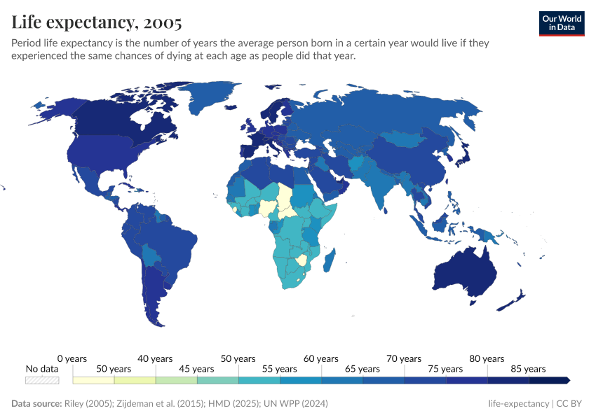 Since period life expectancy estimates are ubiquitous in research and public debate, it is helpful to use an example to flesh out the concept. Let's consider the map showing life expectancy—specifically period life expectancy—at birth in 2005. You can hover the mouse over a country to display the corresponding estimate.