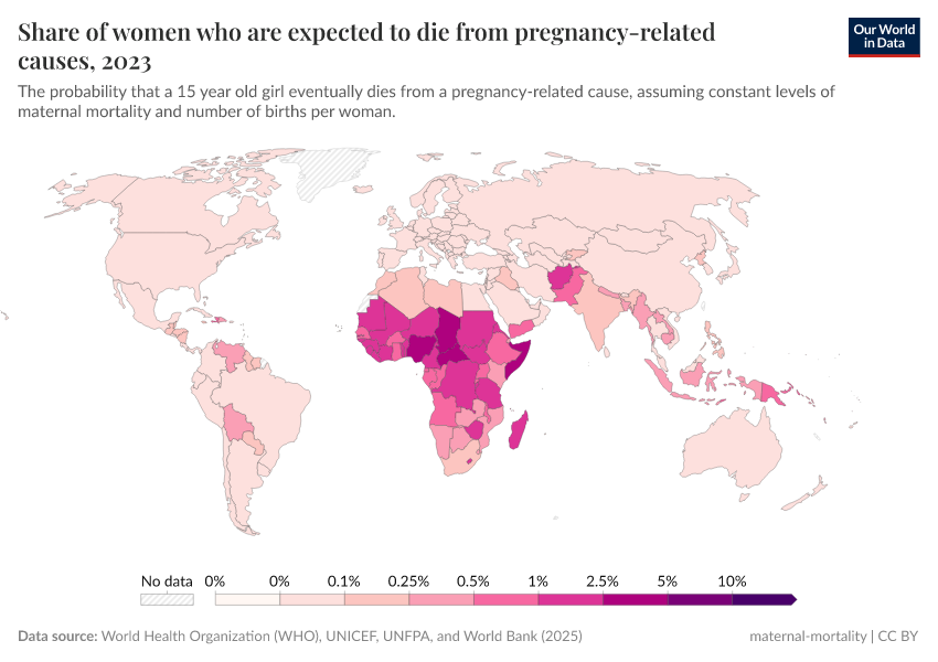 In the chart, we see estimates of the share of women who would die from maternal causes in their lifetime.
