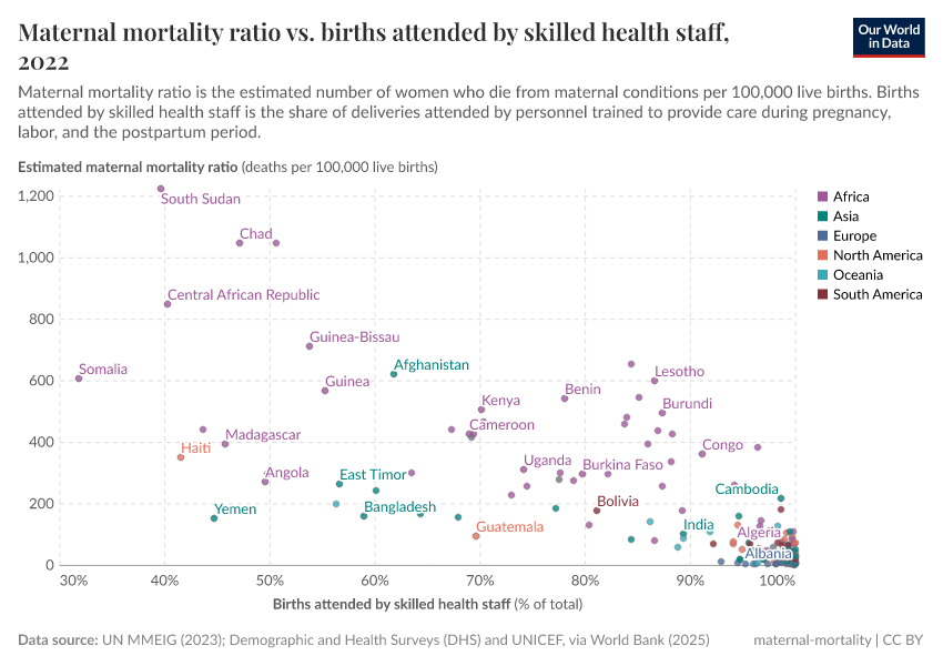 In the first chart, you can see the share of births that are attended by skilled health staff. For most countries this is close to 100%. But there are still some countries where healthcare access is much lower.