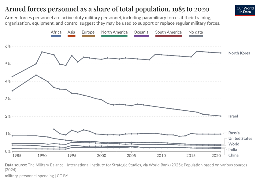 The last chart plots armed forces personnel across countries and world regions. Again there is a broad negative trend in most countries. And these trends also hold if we look at the armed forces as share of labor force.