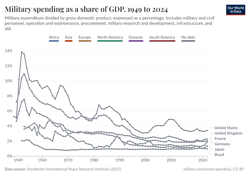 This chart shows military spending as a share of GDP for several countries. We see that since the end of the Second World War, there is a broad negative trend in military budget shares across world regions.