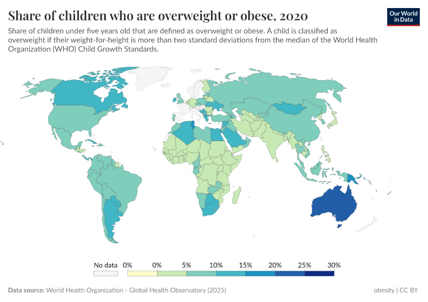 We also provide data on the share of adults that are either overweight or obese. This means having a BMI equal to or greater than 25.