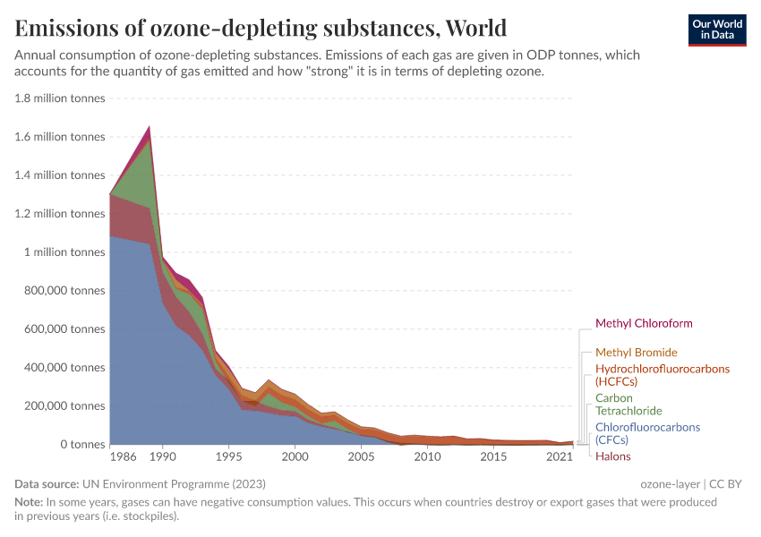 During the 1980s, the world came together to form an international agreement to reduce – and eventually eliminate – emissions of these depleting substances. The political agreements were very effective. Since then, global emissions have fallen by more than 99%.