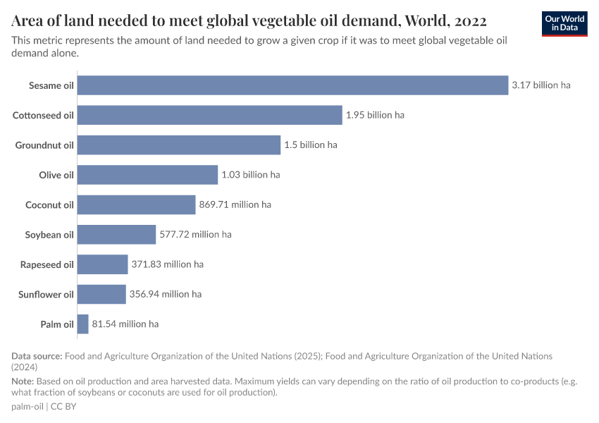 Shown in the chart is the amount of land that the world devotes to vegetable oil crop production. Palm oil accounts for a small slice of this land use, which is notable when we consider that it produces the largest share of the oil.