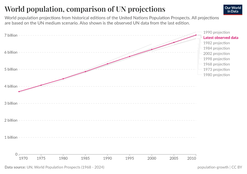 Hannah Ritchie (2023) - “The UN has made population projections for more than 50 years – how accurate have they been?” Published online at OurWorldinData.org. Retrieved from: 'https://enhance-improve-who-empower.owid.pages.dev/population-projections' [Online Resource]BibTeX citation