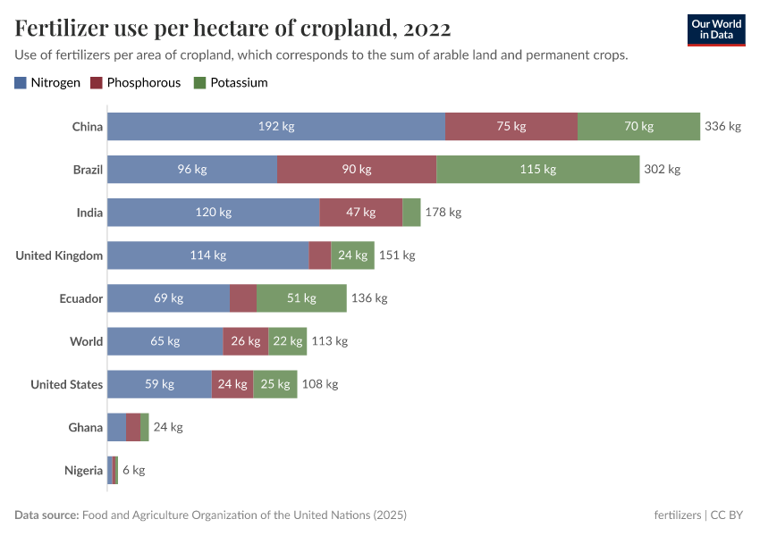 If a soil is lacking nutrients naturally we can add our own. This can be in the form of synthetic fertilizers, or organic additions such as manure. There are very large differences in how much fertilizer is applied across the world. We see this in the charts below: first as a map of average fertilizer use per hectare of cropland; and second, with the breakdown by nutrient in the bar chart.