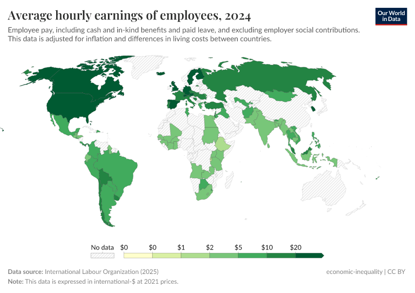 Data for this indicator is shown in the interactive visualisations. The first chart shows average hourly earnings for all employees, and the second chart shows average hourly earnings for male and female employees separately.