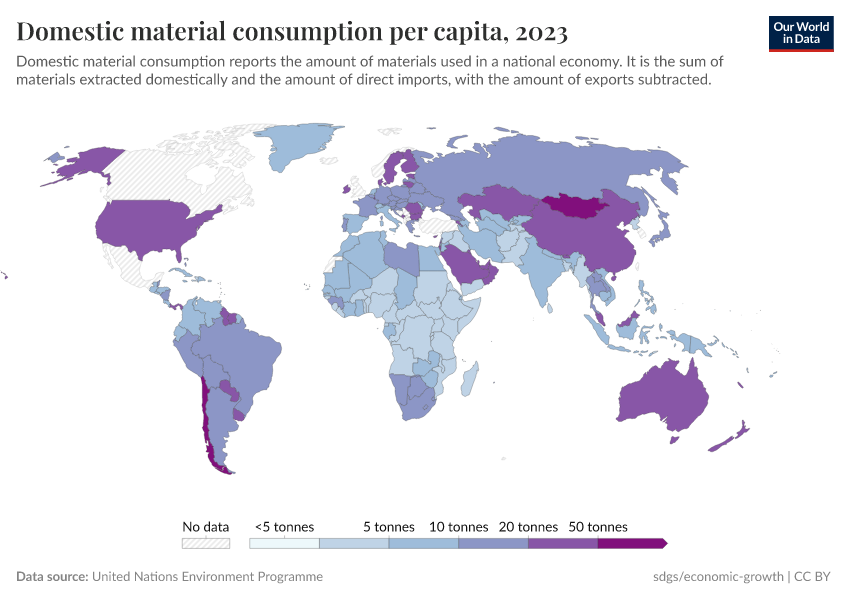 Domestic Material Consumption (DMC) measures the total amount of material directly used in an economy. It is a production-side measure which does not capture the amount needed for within-country demand. This means that a country with high levels of production for export could have a high DMC, while a country that outsources most of its material intensive industrial processes to other countries would have a low DMC.