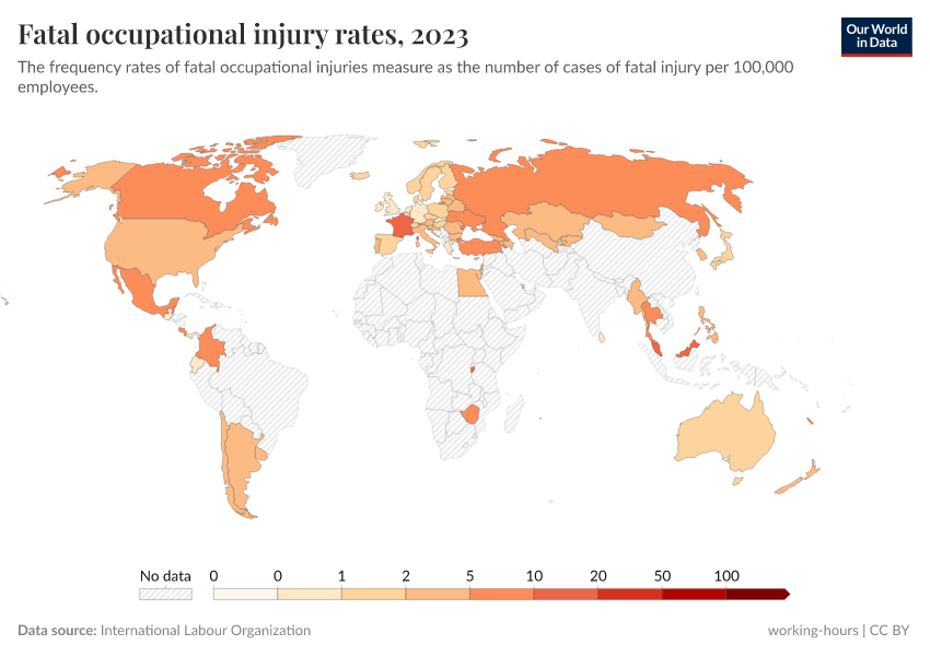 This indicator measures the rates of fatal and non-fatal occupational injuries by country, in terms of the number of injuries per 100,000 employees. An injury in this context refers to any personal injury, disease, or death resulting from an occupational accident; it does not, therefore, include occupational disease, which is the result of exposure over a period of time to risk factors related to the work activity.