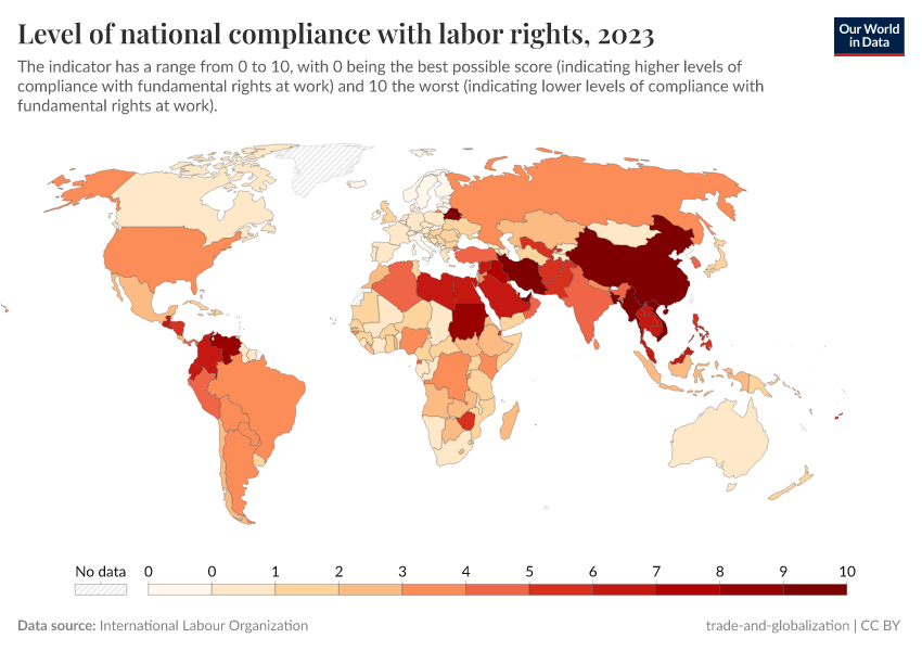 This indicator is measured by coding against a set of evaluation criteria textual sources from International Labour Organization (ILO) reports and national legislation. Values of the indicator range from 0 to 10, with 10 representing the lowest (worst) level of compliance.