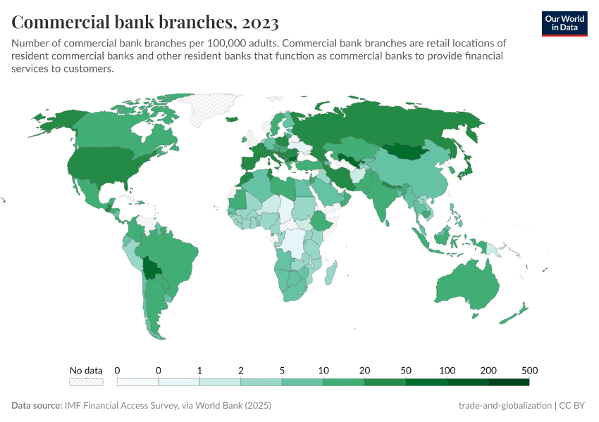 Data for this indicator is shown in the interactive visualizations, with data on commercial bank branches in the first chart and data on ATMs in the second chart.