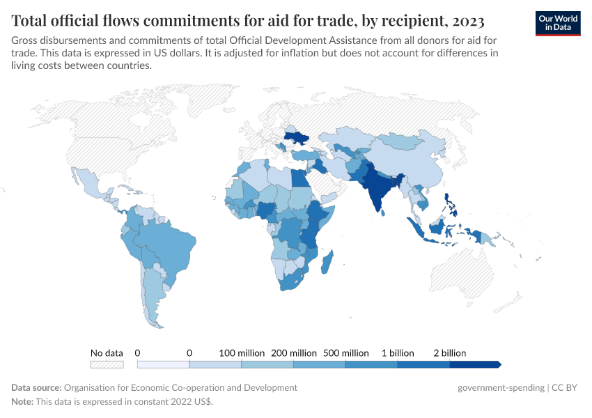 Aid for trade is measured as total official development assistance allocated to aid for trade in millions of constant 2020 United States dollars.